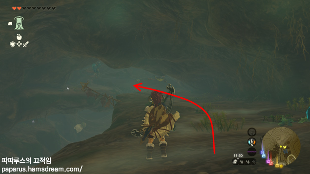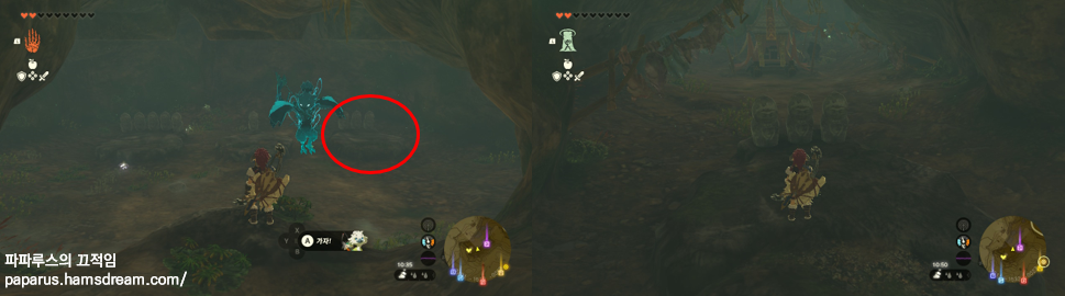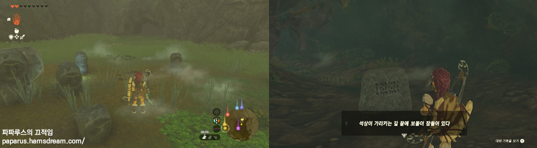 더보기표시된 위치로 이동합니다. 저는 하늘섬에서 날아서 도착했습니다. 동굴 입구에 들어서면 동굴 길 찾기 힌트가 있습니다. 입구과 마찬가지로 석상이 바라보는 방향이 중요한 동굴입니다.