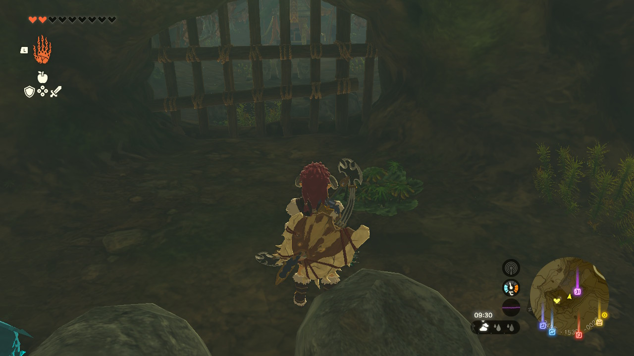 이번에는 너른 공터 가운데 부수고 싶은 바위가 있고(저는 이미 부셔서...) 한 무리에 보코블린이 있습니다. 보통 저는 보스 보코블린에게 혼란꽃을 화살에 붙혀 맞추고 싸움 구경하곤 합니다. 몹이 정리가 되면 정면에 보이는 창살에 가봅시다.