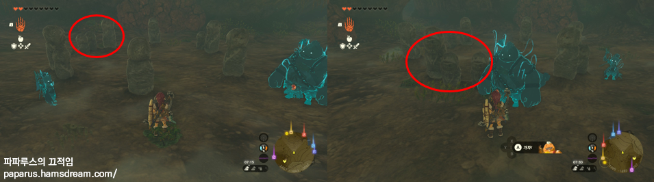 더보기표시된 위치로 이동합니다. 저는 하늘섬에서 날아서 도착했습니다. 동굴 입구에 들어서면 동굴 길 찾기 힌트가 있습니다. 입구과 마찬가지로 석상이 바라보는 방향이 중요한 동굴입니다.