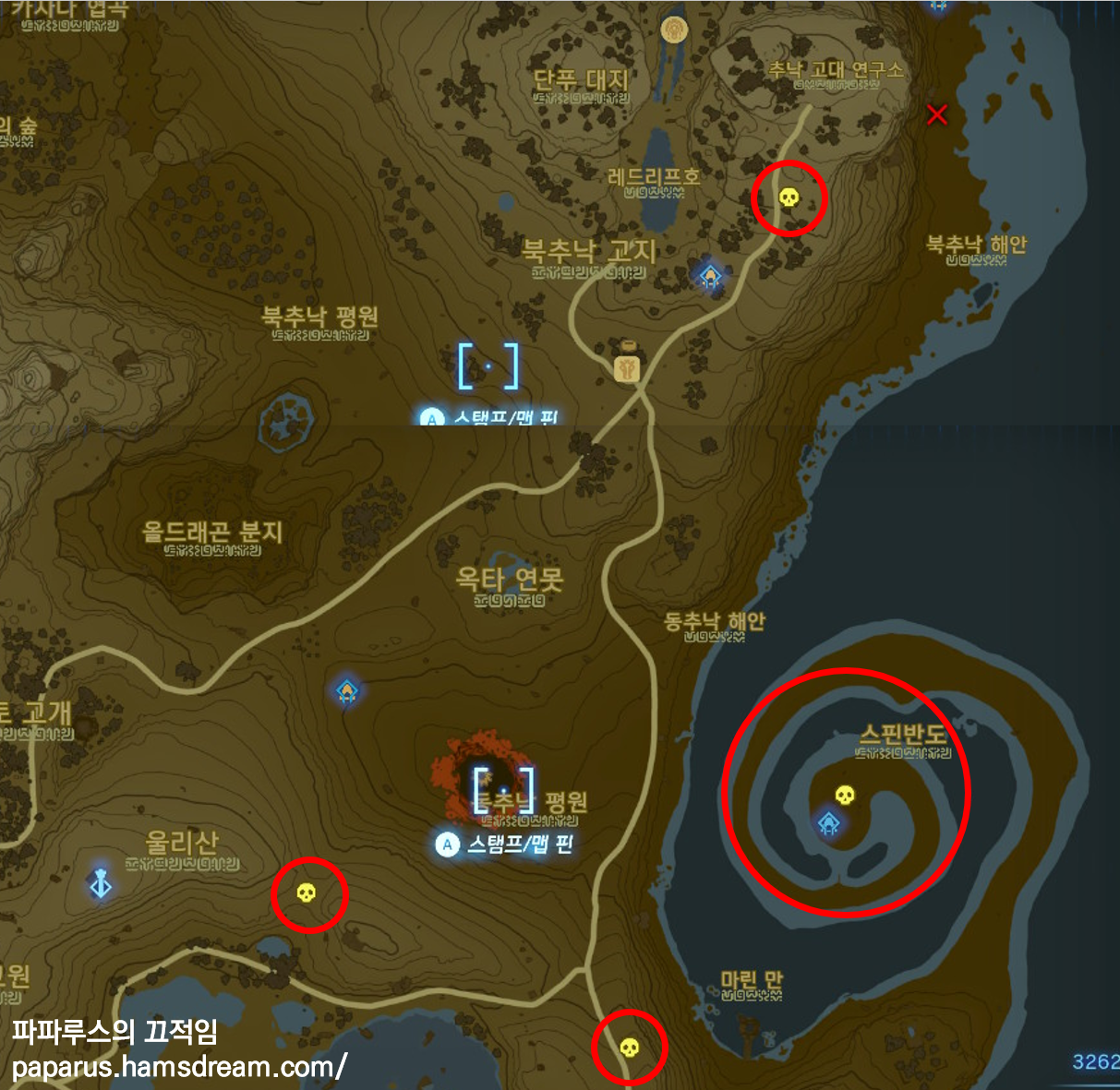 위에 동그라미 친 지역에서 카쿠다를 만날 수 있습니다. 특히 스핀 반도에서는 4마리의 카쿠다를 만날 수 있습니다. 추낙 고대 연구소 앞에서도 카쿠다가 2마리 있습니다.