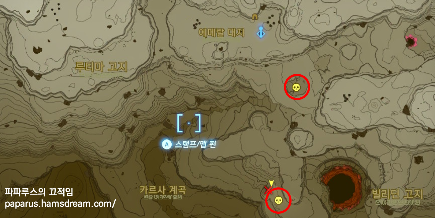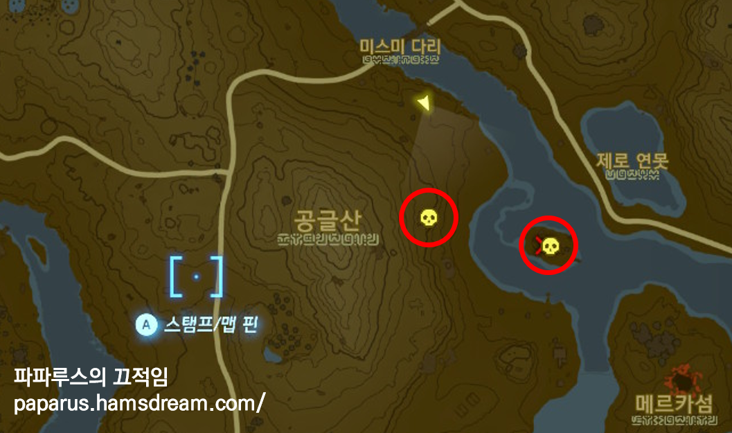 공글산은 감시 요새 3시 방향에 있는 산입니다. 공글산 서쪽에 카쿠다 4마리가 있습니다. 해골로 표시된 두 군데에서 각각 2마리씩 나타납니다. 공글산 동굴 안에 사당이 있는데, 이 사당에서 오시면 좀 더 편할 것 같습니다.
