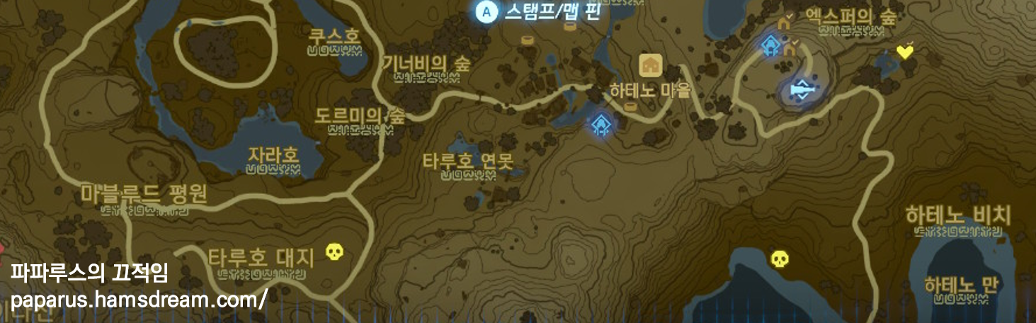 하테노 마을 기준 5시, 7시 지역에도 카쿠다 무리가 나오는 곳이 있습니다. 다만 여기는 동선이 좀 불편한 편입니다. 하테노 마을 고대 연구소 아래에 있는 지역은 페러세일을 타고 날라가기 좋으나, 타루호에 있는 곳은 비추입니다.
