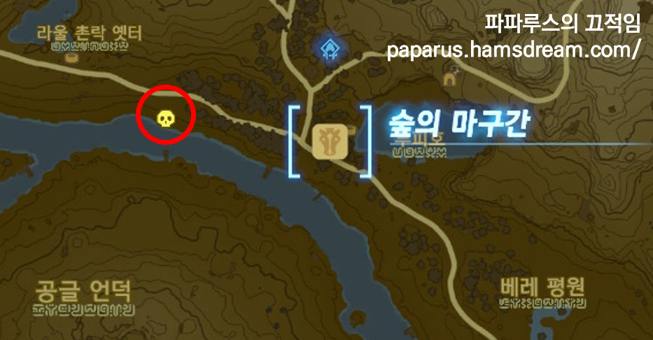 숲의 마구간 서쪽에도 카쿠다가 출몰하는 지역이 있습니다. 다만 사당과의 고도차가 낮아서 날아가기에 살짝 무리가 있는 동선입니다.