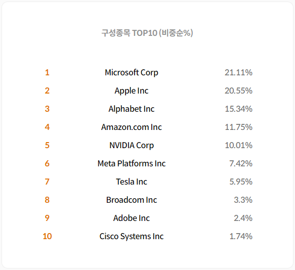 개인적으로 AI를 공부하면 할 수록, 미래의 먹거리는 AI 산업에 있는 것 같습니다. AI 산업을 근간으로 4차 산업혁명이 이뤄지지 않을까 싶습니다. AI를 개발하는 MS, 구글, META를 포함하고, 이를 빠르게 계산하게 해주는 GPU 및 AI 반도체를 설계하는 NVIDIA, 서비스를 제공하는 AWS를 보유한 아마존까지 들어있는 ETF라 앞으로의 전망이 기대됩니다.