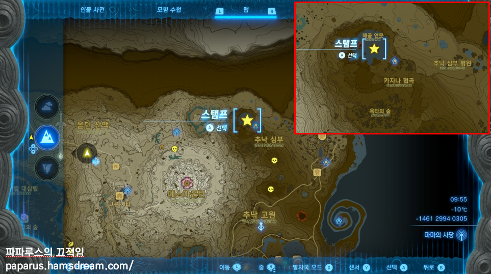 "귀신의 모자"는 데스 마운트 2시 방향 "해골 연못" 내 "해골 연못의 동굴" 에 있습니다. 눈으로 보이는 곳이 동굴이였네요. "울리산 조망대"에서 날아가는 것을 추천하는데, 거리가 멀기 때문에 날아가는 도중 날개를 꺼내서 이동하는 것을 추천합니다. 스테미너가 많이 부족할 수 있습니다.