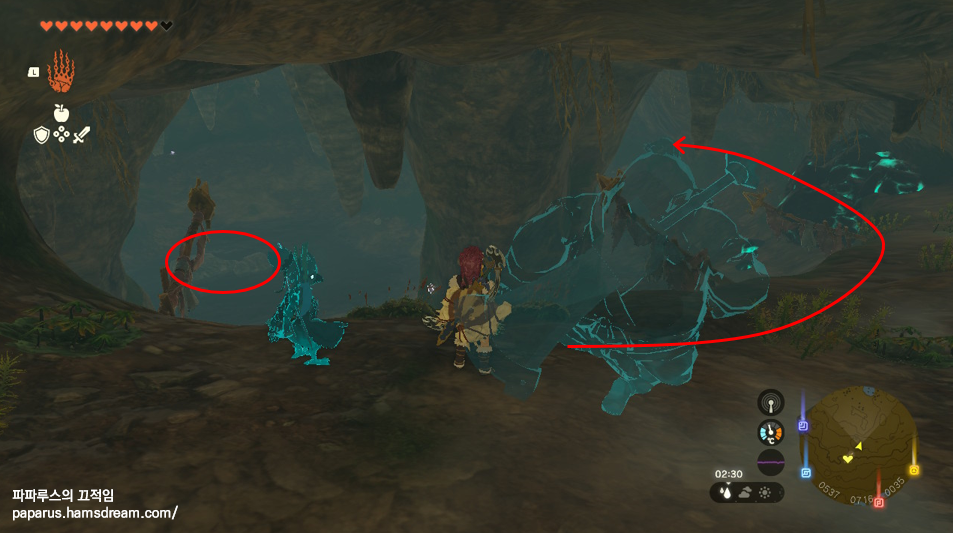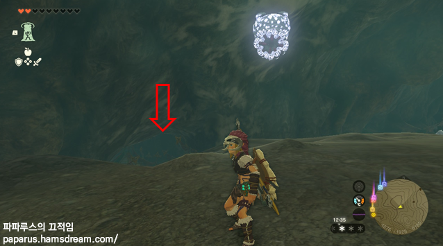 표시된 위치로 이동합니다. 저는 하늘섬에서 날아서 도착했습니다. 동굴 입구에 들어서면 동굴 길 찾기 힌트가 있습니다. 입구과 마찬가지로 석상이 바라보는 방향이 중요한 동굴입니다.