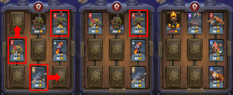 위와 같이 내가 사고 싶은 그롬마쉬가 마침 우상단에 위치해 있네요. 그리고 이것 저것을 고려해 볼 때 3번 배치가 저에겐 좋을 것 같습니다. 그럼 그런트와 늑대를 화살표 방향으로 옮깁니다. 그리고 나서 그롬마쉬를 구매하고 나면, 짜잔, 5개의 칸이 모두 갱신되었습니다.
