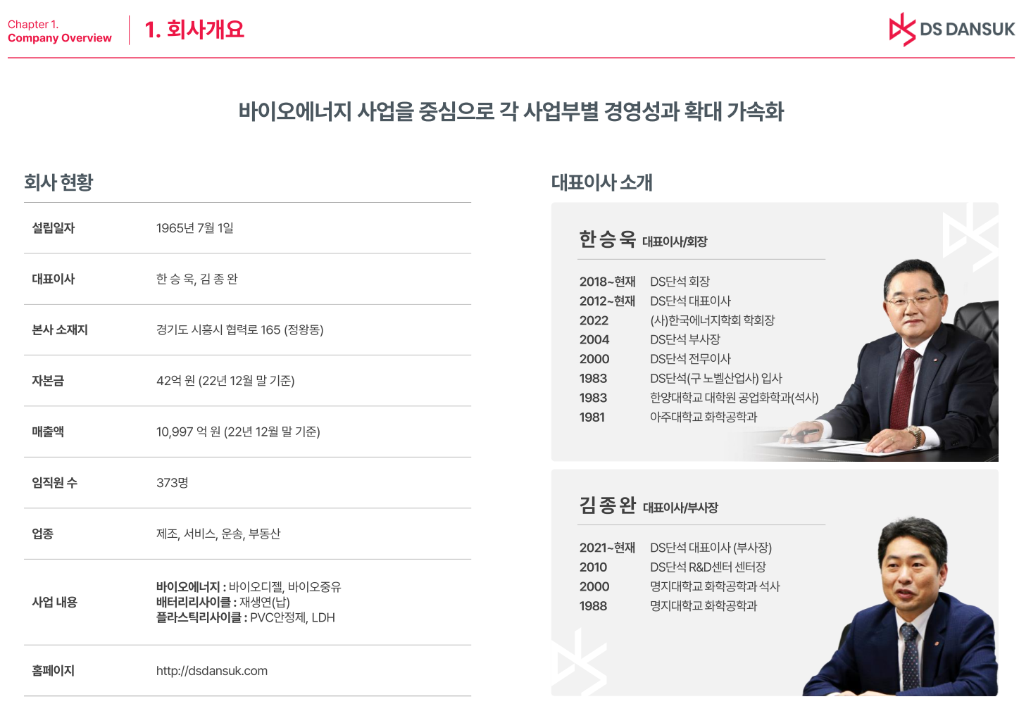 DS단석은 순환경제를 체계화하는 친환경 사업을 영위하는 회사입니다. 세 가지 주요 사업부는 바이오에너지, 배터리 리사이클, 플라스틱 리사이클입니다.