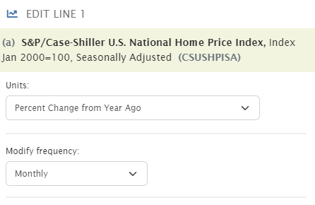 들어가시면 이렇게 보이실텐데요. 여기서 직전연도 대비 변화율로 바꾸시려면, Edit Graph를 누르시고 아래 그림처럼 Units를 "Percent Change from Year Ago"를 선택하시면 됩니다. 그럼 아래 "미국 주택 가격 지수 상승률"과 같은 그래프를 보실 수 있습니다.